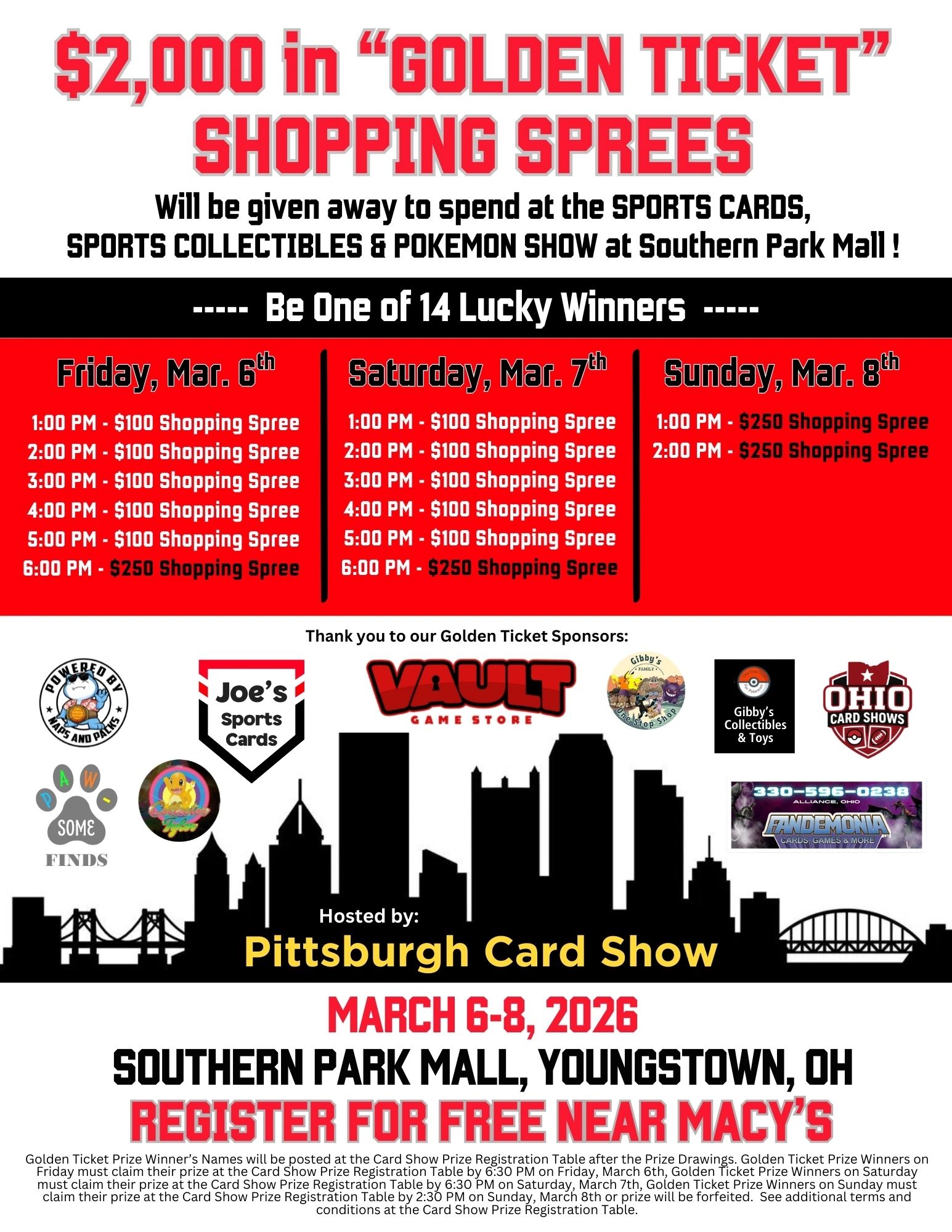 Register for FREE at the Pittsburgh Card Show Table near the center of the mall.